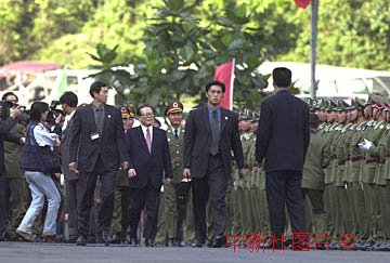 國家主席江澤民二十日在澳門參加回歸慶典中,來到剛剛進(jìn)駐澳門鬧市里的解放軍軍營,檢閱未洗征塵的三軍將士! ≈行律鐢(shù)碼傳真 毛建軍 攝