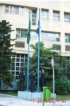 澳門(mén)治安警察局舉行升旗儀式。擁有四千多名警察的治安警察局是當(dāng)日零點(diǎn)將原治安警察廳中的“廳”換掉而改為本名的。 中新社傳真 曾憲成攝