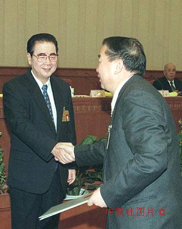 李鵬委員長二十日下午向全國人民代表大會常務委員會澳門特別行政區(qū)基本法委員會組成人員喬曉陽等十人頒發(fā)任命書。圖為喬曉陽主任接受任命書。作者:任海霞