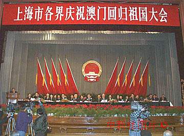 申城各界人士二十日在上海友誼會(huì)堂隆重舉行慶祝澳門回歸祖國(guó)大會(huì),上海市黨政領(lǐng)導(dǎo)和有關(guān)方面人士千余人出席了大會(huì)。作者:吳達(dá)