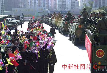 解放軍駐澳門部隊(duì)二十日十二點(diǎn)整前進(jìn)到珠海與澳門相連的關(guān)閘,開始進(jìn)駐澳門,受到珠海軍民的熱烈歡送。中新社數(shù)碼傳真 王瑤攝