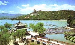 林琴南在《游頤和園記》的散文中,有一小段記從昆明湖東南向西眺望所見(jiàn)的景色:“登繡漪橋西望玉帶橋,穹然高起,于湖西前后二橋,其上皆有亭,隱隱然均不能至,而西北望玉泉之山,微見(jiàn)樓殿數(shù)疊,出萬(wàn)樹(shù)上!崩ッ骱髅骈L(zhǎng)堤、玉帶橋、鏡橋、石橋等等是很少人走到的,不論是在龍王廟岸上看,或者在昆明湖劃船時(shí)在船上看,都有一種“隱隱然均不能至”的感覺(jué),至于玉泉山,則更是有這種感覺(jué)了。