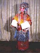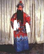 長袍類 一、蟒:也稱龍袍、蟒袍,是帝、王、將、相在朝賀宴會或辦公事的時候所穿的禮服。 蟒的樣式是圓領(lǐng)、大襟、長度一般拖到腳面,袖子寬闊、肥大,帶水袖,配有寬松的腰帶。 這是戲曲舞臺上扮演帝王、官員等角色使用量最多的一種蟒袍,扮演文臣武將的老生、小生、武生都可使用。在戲曲舞臺上,常由蟒袍的色彩來區(qū)別劇中任的身份、地位與年齡。蟒袍大體分為紅、明黃、杏黃、白、藍(lán)、綠、紫、粉紅、淡湖、淺米、古銅、豆沙、香色等。原箱蟒袍分為上、下五色,上五色是紅、綠、黃、白、黑色;下五色是藍(lán)、紫、粉紅、淡青和香色。明黃與杏黃是扮演皇帝、番王、王子以及齊天大圣(孫悟空)的蟒袍專用色,其他角色不得使用。 蟒的圖案主要是龍形圖案。十團龍蟒袍在繡工上大體分為彩繡、墨繡、平金漏地繡、滿金繡、半金半彩繡、裹金繡(一金線、一彩線混合繡)等。繡法各異,色彩紛呈。不同的繡工處理與十團龍圖案相配合,使得十團龍蟒袍造型莊重、文雅、氣派。 穿用十團龍蟒袍的有《甘露寺》中的劉備(因是漢中山靖王劉勝之后,漢景帝之玄孫,過江招親時,穿紅色十團龍袍)、《秦香蓮》中的陳世美(因考中狀元,被招為東床駙馬后,穿十團龍紅色蟒袍)、《玉堂春》中的王金龍(因中頭名狀元,并被封為八府巡按,當(dāng)他會同藩司、臬司三堂會審舊時情人蘇三(玉堂春)時,穿十團龍紅色蟒袍)。 而平金繡散龍黑色蟒袍則是戲曲舞臺上扮演花臉行當(dāng)?shù)奈某、武將的官服或朝服。舞臺上常見的散龍蟒袍有黑、藍(lán)、紫、綠、杏黃等色。 散龍圖案式樣繁多,其造型比團龍活潑、豪放。如散坐龍、散升龍、散降龍、倒掛龍、噴水龍、串水龍、串云龍、回頭龍、教子升天龍(一大龍、一小龍)、戲珠升降龍等等,均是散龍大蟒袍常用的圖案。 制作時以平金繡為主,稍加彩繡為裝飾色,配合騰云飛舞的散龍圖案,及大面積金海水為下擺(海水江芽),其造型格外莊重輝煌。 穿用人物有《秦香蓮》中的包文正(包公)、《霸王別姬》中的項羽(在出征前,除名演員穿黃色蟒袍外,一般都穿黑色散龍大蟒袍)等。 在戲曲舞臺上扮演地位較高而又到蒼老年齡的文職官員,其穿用的朝服有裹金繡香色蟒袍。因為專為老年官員穿用,所以力求色彩沉穩(wěn),但又不失輝煌效果。制法上采用一線一金的"裹金繡",繡制團龍圖案。穿用人物有《甘露寺》中的喬玄、《秦香蓮》中的王延齡等。 而彩繡豆沙色蟒袍則適合舞臺上扮演地位較高,而又不到蒼老年齡的文職官員穿用。制作時要求色彩文雅,采用團龍圖案,用雅彩裹金繡繡制海水江芽。穿用人物如《將相和》中的藺相如。 彩繡紅色女蟒袍一般為戲曲舞臺上扮演皇后、貴妃、公主、誥命夫人(受皇帝冊封的貴婦)及掛帥女將等的朝服和公服。有時也當(dāng)作世宦人家結(jié)婚時的禮服。以紅色為主,分為彩繡與平金繡兩種;y多用團鳳、散鳳和牡丹等,也可龍鳳并用。蟒袍下擺繡有"海水江芽"。女蟒袍有老式和新式兩種式樣。老式女蟒袍,外緣加寬邊;新式女蟒袍形同男蟒袍,不加外邊緣。色彩要求艷麗、輝煌,體現(xiàn)出人物的雍容華貴。 穿用人物有《貴妃醉酒》中的楊玉環(huán)(身著紅色女蟒袍到百花亭侯駕)、《大登殿》中的王寶釧(身穿紅色女蟒袍上朝見君受封為昭陽正宮娘娘)。 老旦蟒袍多為戲曲舞臺上扮演皇太后和地位較高的誥命老夫人穿用的朝服或公服, 穿用人物有《太君辭朝》中的佘太君、《甘露寺》中孫權(quán)之母吳氏。 在戲曲舞臺上扮演番邦后妃、公主等的朝服,一般稱為女旗蟒袍。以紅色地為主,分彩繡與平金繡兩種,用團龍、團鳳和龍鳳等圖案。清朝服裝的女旗蟒袍不用"護領(lǐng)",用湖色硬翻領(lǐng)(類似現(xiàn)代襯衣硬領(lǐng))(領(lǐng)衣),蟒袍下擺海水無開起,旗蟒身長以不露鞋為標(biāo)準(zhǔn)。 穿用人物有《四郎探母》中的鐵鏡公主(朝見蕭太后穿朝服女旗蟒袍)、《大登殿》中的代戰(zhàn)公主(上殿朝駕時穿朝服旗蟒)。 蟒中還派生出兩種袍服:一種是官衣,一種是宮衣。 1.官衣:是一般文職官員穿用的禮服。式樣同蟒。圖案是在胸前和背后繡一塊方形的圖案,官衣的色彩有紅、藍(lán)、紫、黑、古銅等。 官衣多為戲曲舞臺上扮演新科狀元、榜眼、探花等角色臨時的官服。待任命官職之后再按品級穿官服。官衣,還可作為七品縣官和新婚典禮中新郎官的吉服。 官衣顏色多為紅色、藍(lán)色、紫色、黑色和白色。黑色官衣品級最低,多為驛丞(驛站站長)、門官等穿用,不綴補子。白色為國喪孝服(不常用)。它的造型基本上是明代官服的原樣,只是加以藝術(shù)的美化和提高。 明代官衣不用素地,多用暗紋云錦織成衣料,而舞臺上大部分用素地(因云錦造價太高)。 明代官服補子(官員品級標(biāo)志)多在衣服的前胸、后背部直接繡成,而清代官服品級標(biāo)志是先繡成補子,然后再綴到天青色褂子上。 穿用人物有《御碑亭》中的王有道和柳生春(在"拜恩師"一場中,二人同穿大紅官衣)、《馬前潑水》中的朱買臣(中了狀元后,夸官游街時身穿大紅官衣)等。 女官衣多是戲曲舞臺上扮演老年誥命夫人(一品官的妻子)和女官的官服,顏色多為醬紫、古銅、香色等。女官衣在解放前的舞臺上使用較多,因那時的演出團體經(jīng)濟條件較差,常用各種色彩的補子女官衣替代